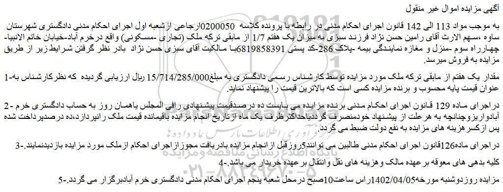به موجب مواد 113 الی 142 قانون اجرای احکام مدنی در رابطه با پرونده کلاسه 0200050ارجاعی ازشعبه اول اجرای احکام مدنی دادگستری شهرستان ساوه ،سهم الارث آقای رامین حسن نژاد فرزند سبزی به میزان یک هفتم 1/7 از مابقی ترکه ملک (تجاری -مسکونی) واقع درخرم آباد-خیابان خاتم الانبیا-چهارراه سوم -منزل و مغازه نمایندگی بیمه -پلاک 286-کد پستی 6819858391با مالکیت آقای سبزی حسن نژاد بادر نظر گرفتن شرایط زیر از طریق مزایده به فروش میرسد.