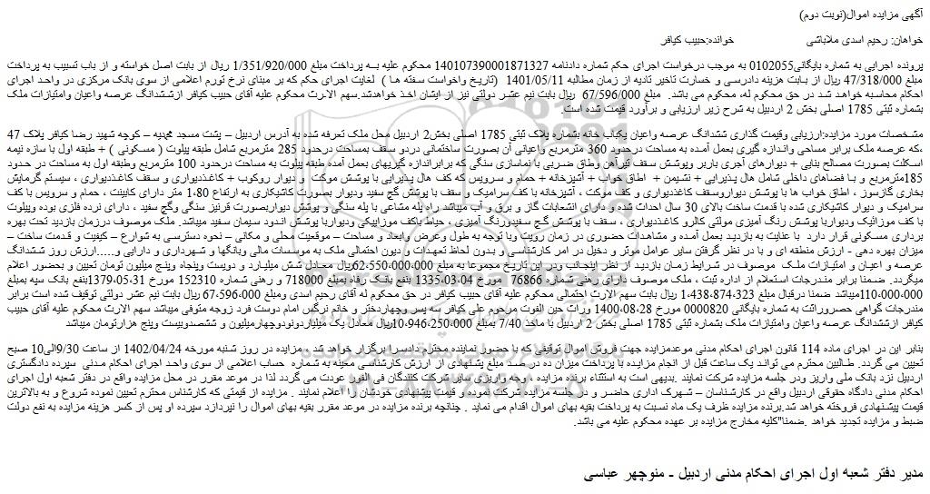 پرونده اجرایی به شماره بایگانی0102055 به موجب درخواست اجرای حکم شماره دادنامه 140107390001871327 محکوم علیه ﺑــﻪ پرداخت ﻣﺒﻠﻎ 1/351/920/000 رﯾﺎل از بابت اصل خواسته و از باب تسبیب به پرداخت مبلغ 47/318/000 ریال از بابت هزینه دادرسی و خسارت تاخیر تادیه از زمان مطالبه 1401/05/11 (تاریخ واخواست سفته ها ) لغایت اجرای حکم که بر مبنای نرخ تورم اعلامی از سوی بانک مرکزی در واحد اجرای احکام محاسبه خواهد شد در حق محکوم له، محکوم می باشد. مبلغ 67/596/000 ریال بابت نیم عشر دولتی نیز از ایشان اخذ خواهدشد.سهم الارث محکوم علیه آقای حبیب کیافر ازششدانگ عرصه واعیان وامتیازات ملک بشماره ثبتی 1785 اصلی بخش 2 اردبیل به شرح زیر ارزیابی و برآورد قیمت شده است.