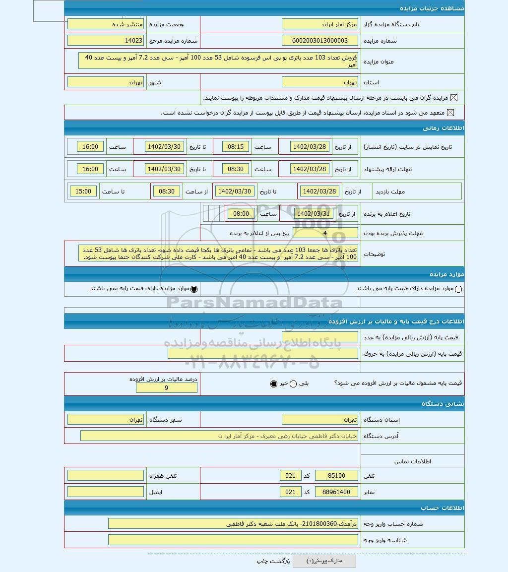 | نام دستگاه مزایده گزار | مرکز امار ایران | وضعیت مزایده | منتشر شده | |
