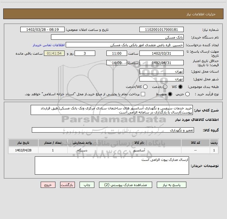 استعلام خرید خدمات سرویس و نگهداری آسانسور های ساختمان ستادی مرکزی ونک بانک مسکن(طبق قرارداد پیوست)ارسال یا بارگذاری در سامانه الزامی است, استعلام خرید خدمات سرویس و نگهداری آسانسور های ساختمان ستادی مرکزی ونک بانک مسکن(طبق قرارداد پیوست)ارسال یا بارگذاری در سامانه الزامی است