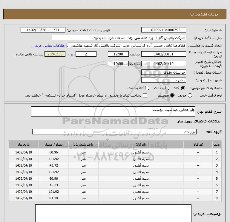 شرح کلی نیاز: وایر مطابق دیتاشیت پیوست