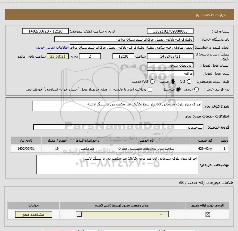 شرح کلی نیاز: اجرای دیوار بلوک سیمانی 68 متر مربع و19/2 متر مکعب پی با سنگ لاشه