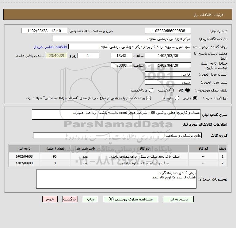 شرح کلی نیاز: هندل و کارتریج خطی برشی 80 - شرکت مجوز imed داشته باشد- پرداخت اعتباری