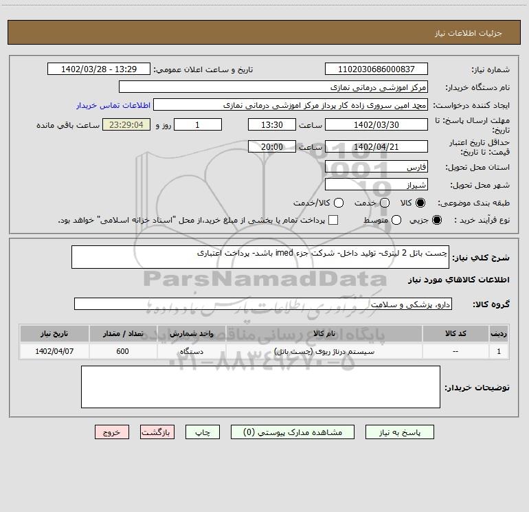 شرح کلی نیاز: چست باتل 2 لیتری- تولید داخل- شرکت جزء imed باشد- پرداخت اعتباری