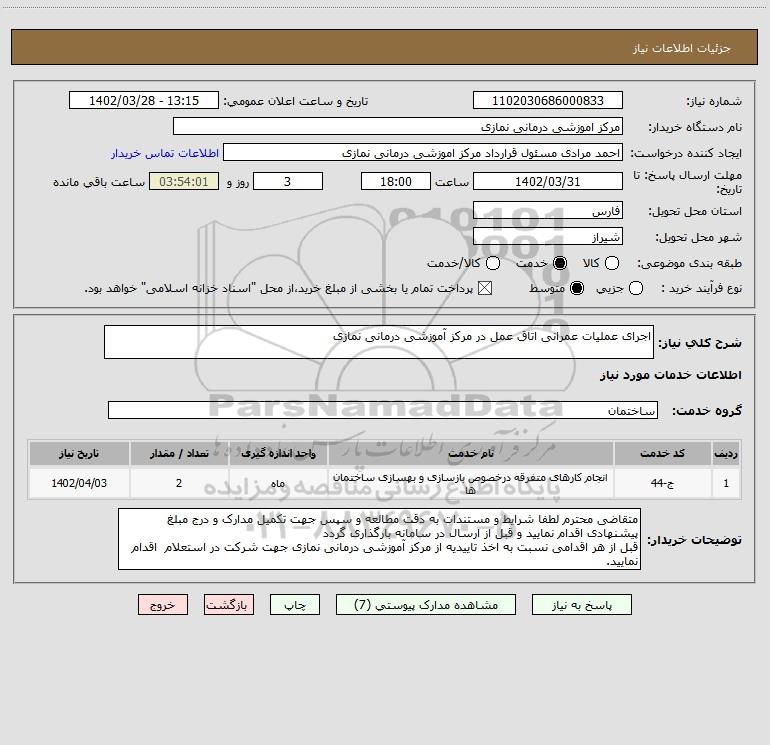 شرح کلی نیاز: اجرای عملیات عمرانی اتاق عمل در مرکز آموزشی درمانی نمازی