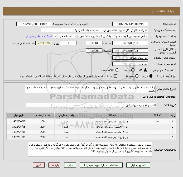 شرح کلی نیاز: پنا ال ای دی طبق پیوست- پیشنهاد مالی و فنی پیوست گردد . برند های شب فروز و مهسازان مورد تایید می باشد.