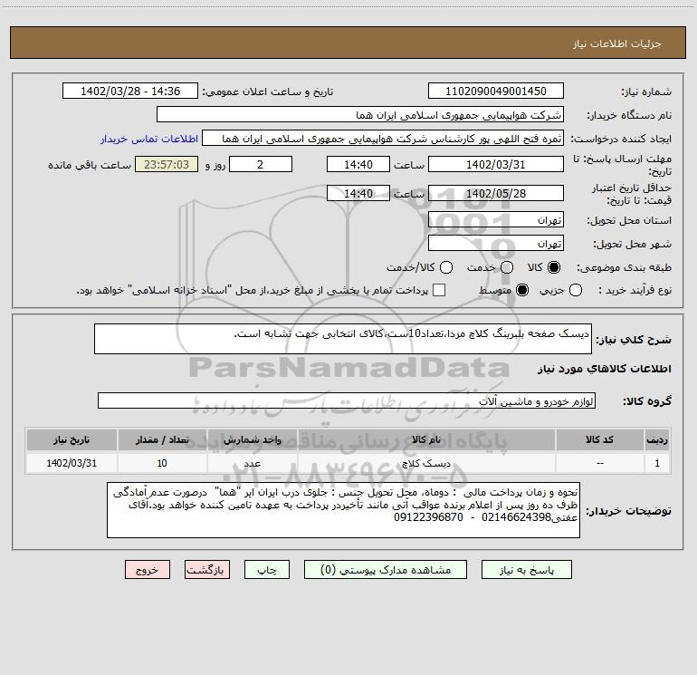 | 1 | -- | دیسک کلاچ | عدد | 10 | 1402/03/31 |