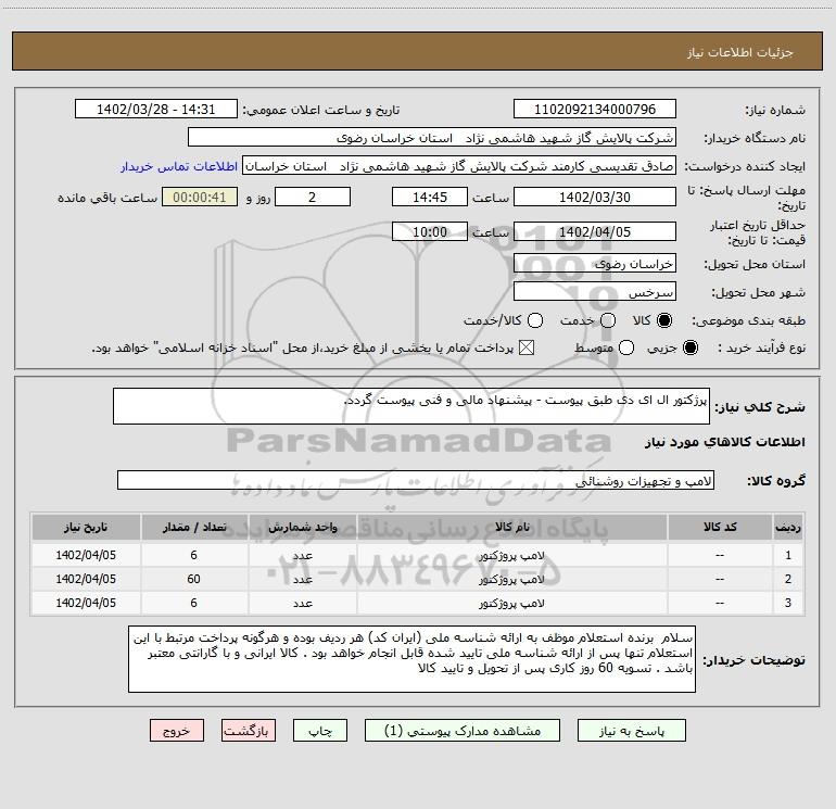 نام دستگاه خریدار:شرکت پالایش گاز شهید هاشمی نژاد استان خراسان رضوی