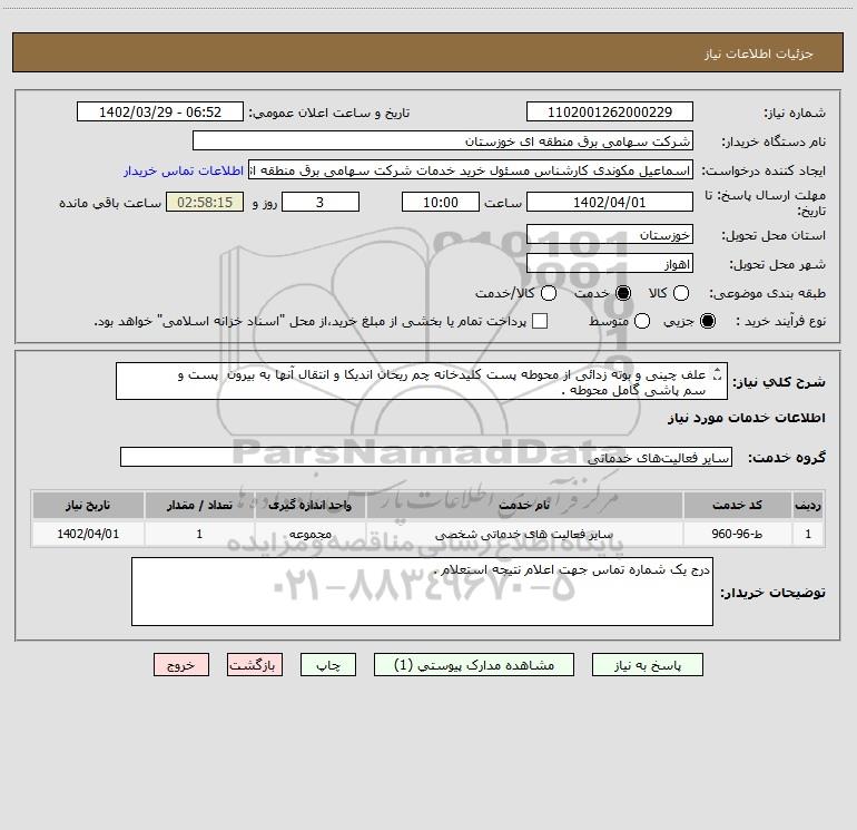 استعلام علف چینی و بوته زدائی از محوطه پست کلیدخانه چم ریحان اندیکا و انتقال آنها به بیرون پست و سم پاشی گامل محوطه ., استعلام علف چینی و بوته زدائی از محوطه پست کلیدخانه چم ریحان اندیکا و انتقال آنها به بیرون پست و سم پاشی گامل محوطه .