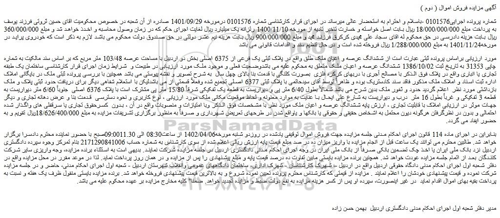 شماره پرونده اجرایی0101576 -باسلام و احترام به استحضار عالی میرساند در اجرای قرار کارشناسی شماره 0101576 درمورخه 1401/09/29 صادره از آن شعبه در خصوص محکومیت اقای حسین ثروتی فرزند یوسف به پرداخت مبلغ 18/000/000/000 ریال بابت اصل خواسته و خسارت تاخیر تادیه از مورخه 1400/11/10 رئزانه یک میلیارد ریال لغایت اجرای حکم که در زمان وصول محاسبه و اخدذ خواهد شد و مبلغ 360/000/000 ریال بابت هزینه دادرسی در حق محکوم له اقای سجاد علی محمدی کرکرق فرزند محمد و مبلغ 900/000/000 ریال بابت هزینه نیم عشر دولتی در حق صندوق دولت محکوم می باشد لازم به ذکر است که خودروی پراید در مورخه1401/11/24 به مبلغ 1/288/000/000 ریال فروخته شده است و در حال تنظیم سند و اقدامات قانونی می باشد