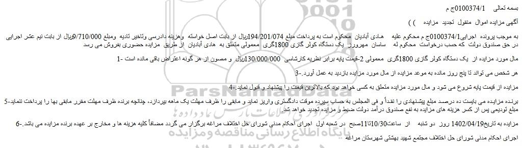 به موجب پرونده اجرایی0100374/1ج م محکوم علیه هادی آبادیان محکوم است به پرداخت مبلغ 194/201/074ریال از بابت اصل خواسته وهزینه دادرسی وتاخیر تادیه ومبلغ 9/710/000ریال از بابت نیم عشر اجرایی در حق صندوق دولت که حسب درخواست محکوم له ساسان مهرورز یک دستگاه کولر گازی 1800گری معمولی متعلق به هادی آبادیان از طریق مزایده حضوری بفروش می رسد