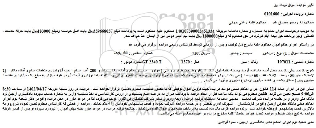 مشخصات اموال : 1) نوع : تراکتور سیستم : جاندیر سریال :710 شماره انتظامی : فاقد پلاک