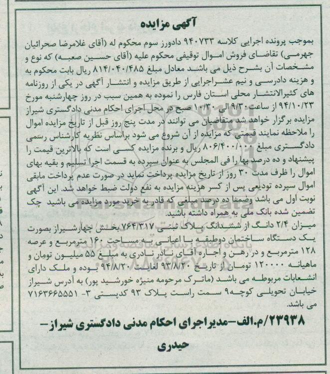 مزایده کلاسه 940733 میزان 2.4 دانگ از ششدانگ پلاک ثبتی بصورت ساختمان 2طبقه با اعیانی