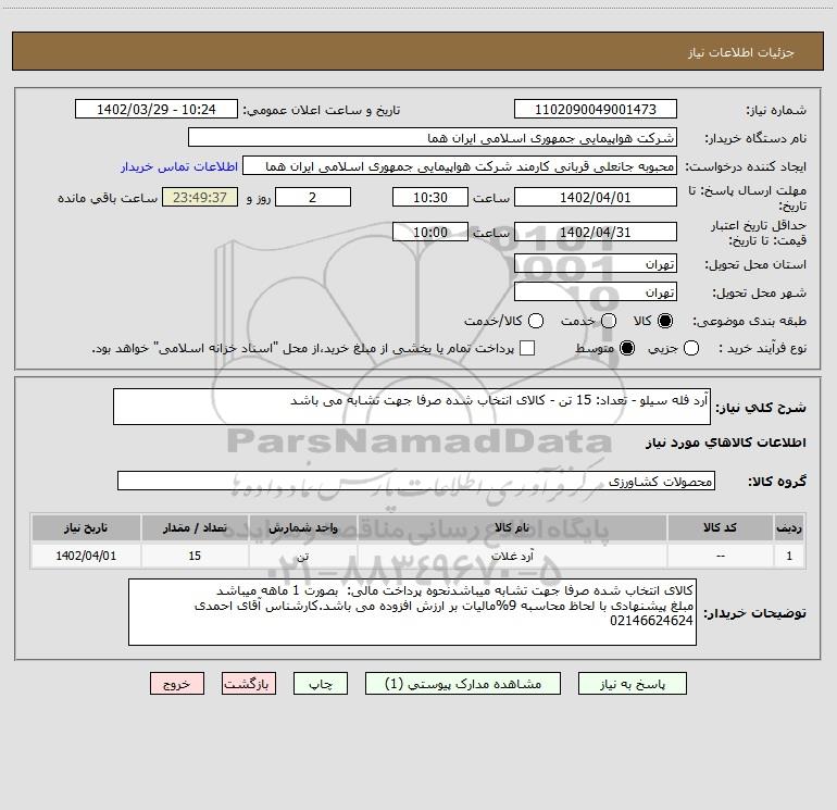 شرح کلی نیاز: آرد فله سیلو - تعداد: 15 تن - کالای انتخاب شده صرفا جهت تشابه می باشد