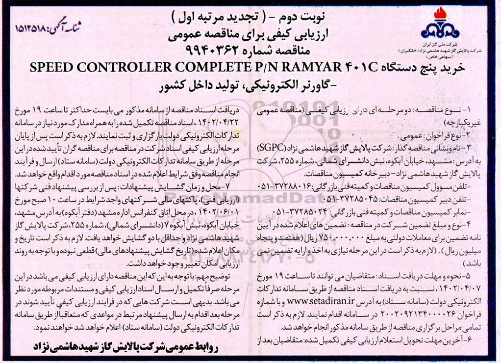 تجدید ارزیابی کیفی مناقصه خرید پنج دستگاه 401C SPEED CONTROLLER COMPLETE P/N RAMYAR گاورنر الکترونیکی - نوبت دوم از کلیه افراد متخصص و شرکتها واجد شرایط دعوت به عمل میآید در مناقصه با کد خبرگزاری پارس نماد: 5974311 شرکت نمایند.