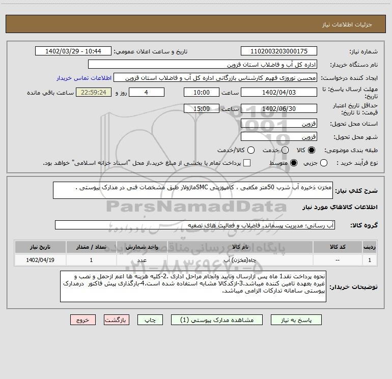 شرح کلی نیاز: مخزن ذخیره آب شرب 50متر مکعبی ، کامپوزیتی SMCماژولار طبق مشخصات فنی در مدارک پیوستی .
