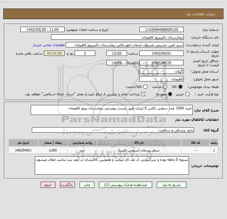 شرح کلی نیاز: خرید 1000 عدد سفتی باکس 5 لیتری طبق لیست پیوستی بیمارستان پیروز لاهیجان