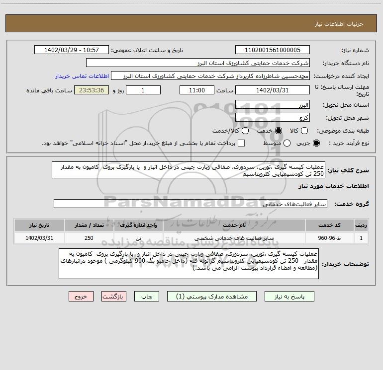 شرح کلی نیاز: عملیات کیسه گیری ،توزین، سردوزی، صفافی وپارت چینی در داخل انبار و یا بارگیری بروی کامیون به مقدار 250 تن کودشیمیایی کلروپتاسیم