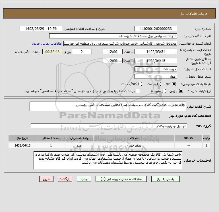 شرح کلی نیاز: لوازم موتوری خودرو(کیت کلاچ-سرسیلندر و...) مطابق مشخصات فنی پیوستی
