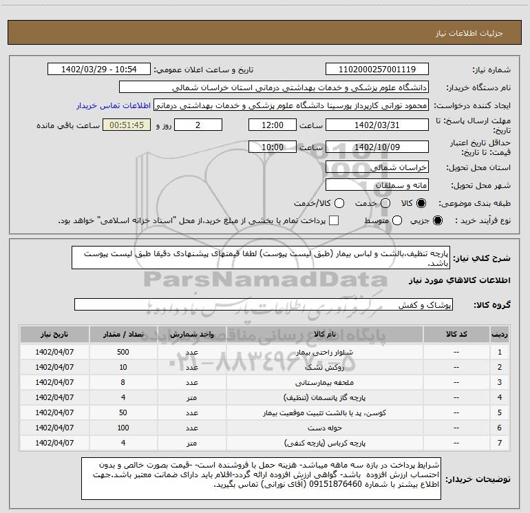 شرح کلی نیاز: پارچه تنظیف،بالشت و لباس بیمار (طبق لیست پیوست) لطفا قیمتهای پیشنهادی دقیقا طبق لیست پیوست باشد.