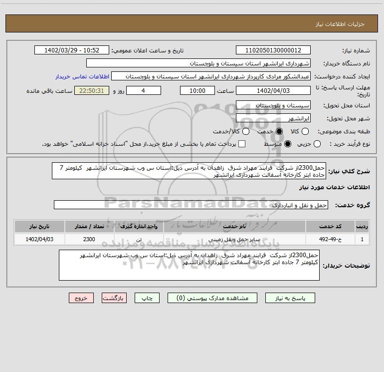 شرح کلی نیاز: حمل2300از شرکت فرابند مهراد شرق زاهدان به آدرس ذیل:استان س وب شهرستان ایرانشهر کیلومتر 7 جاده ابتر کارخانه آسفالت شهرداری ایرانشهر