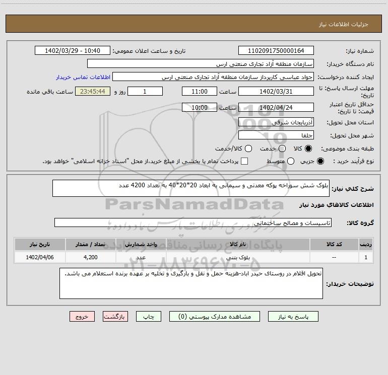 شرح کلی نیاز: بلوک شش سوراخه پوکه معدنی و سیمانی به ابعاد 20*20*40 به تعداد 4200 عدد