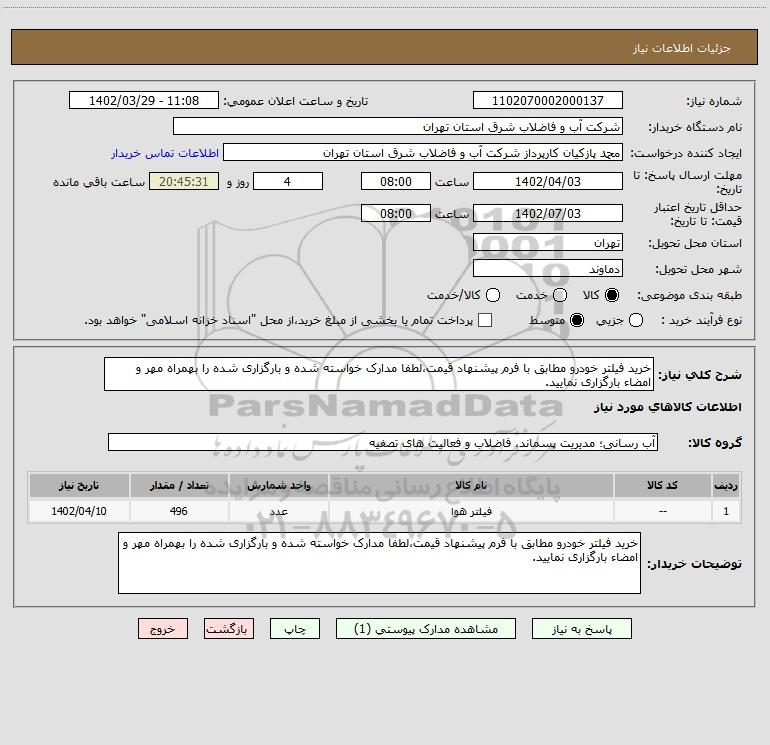 استعلام خرید فیلتر خودرو مطابق با فرم پیشنهاد قیمت،لطفا مدارک خواسته شده و بارگزاری شده را بهمراه مهر و امضاء بارگزاری نمایید., استعلام خرید فیلتر خودرو مطابق با فرم پیشنهاد قیمت،لطفا مدارک خواسته شده و بارگزاری شده را بهمراه مهر و امضاء بارگزاری نمایید.
