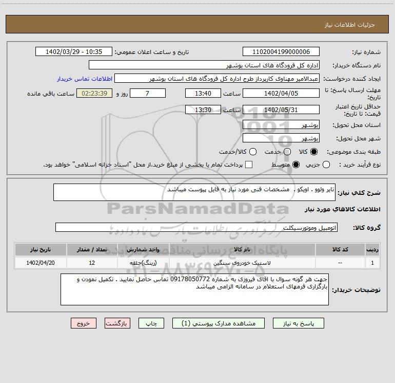 شرح کلی نیاز: تایر ولوو . اویکو . مشخصات فنی مورد نیاز به فایل پیوست میباشد