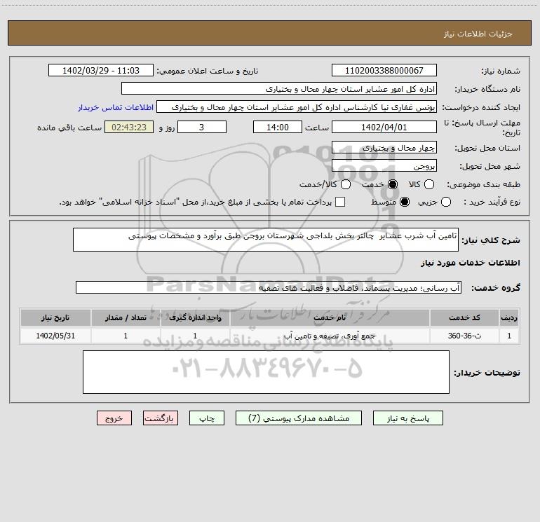 شرح کلی نیاز: تامین آب شرب عشایر چالتر بخش بلداجی شهرستان بروجن طبق برآورد و مشخصات پیوستی