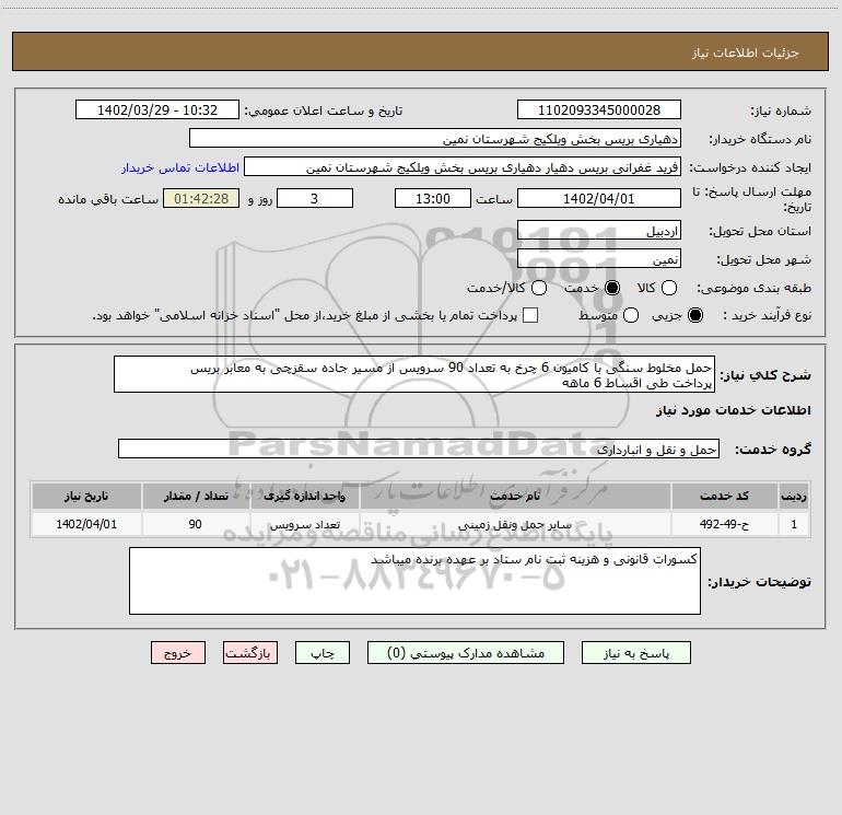 شرح کلی نیاز: حمل مخلوط سنگی با کامیون 6 چرخ به تعداد 90 سرویس از مسیر جاده سقزچی به معابر بریس