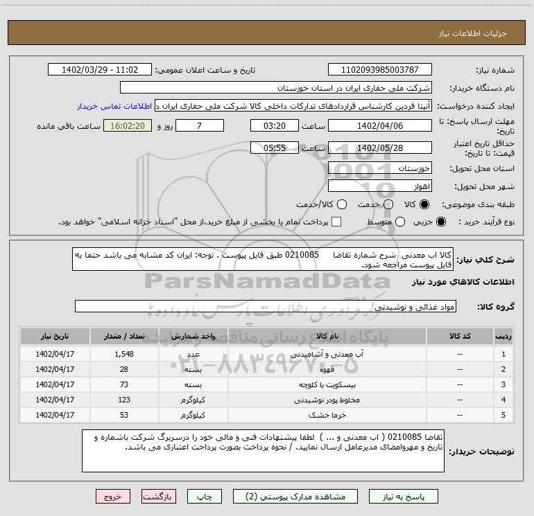 توضیحات خریدار:تقاضا 0210085 ( اب معدنی و ... ) لطفا پیشنهادات فنی و مالی خود را درسربرگ شرکت باشماره و تاریخ و مهروامضای مدیرعامل ارسال نمایید. / نحوه پرداخت بصورت پرداخت اعتباری می باشد.