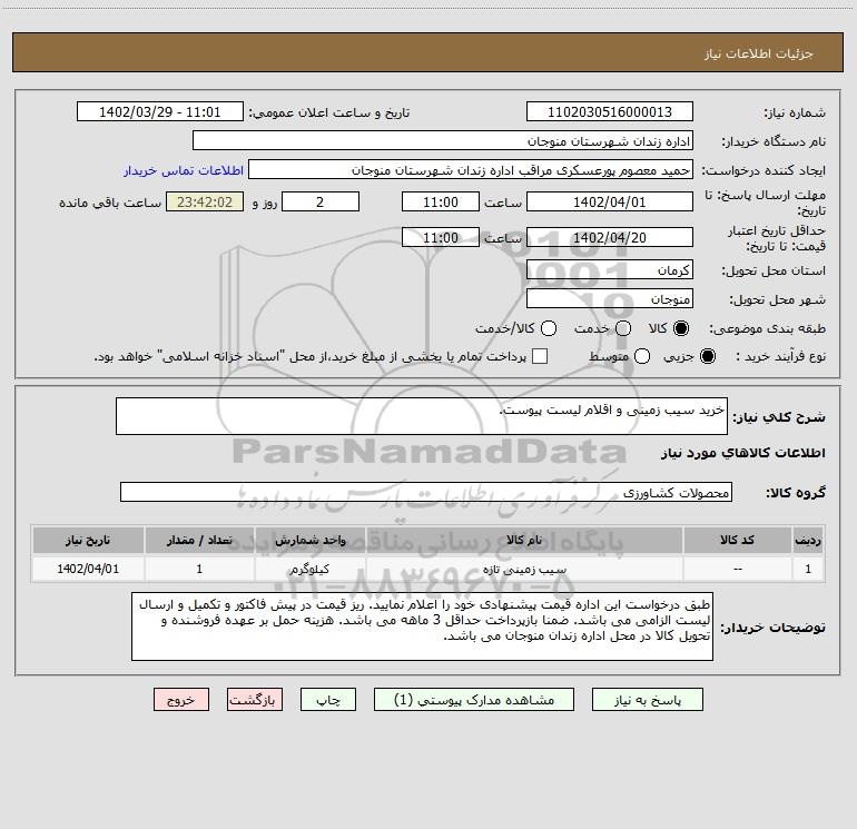 شرح کلی نیاز: خرید سیب زمینی و اقلام لیست پیوست.