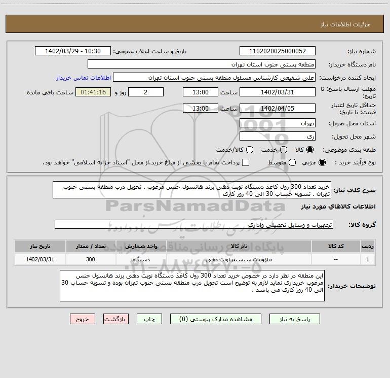شرح کلی نیاز: خرید تعداد 300 رول کاغذ دستگاه نوبت دهی برند هانسول جنس مرغوب . تحویل درب منطقه پستی جنوب تهران . تسویه حساب 30 الی 40 روز کاری