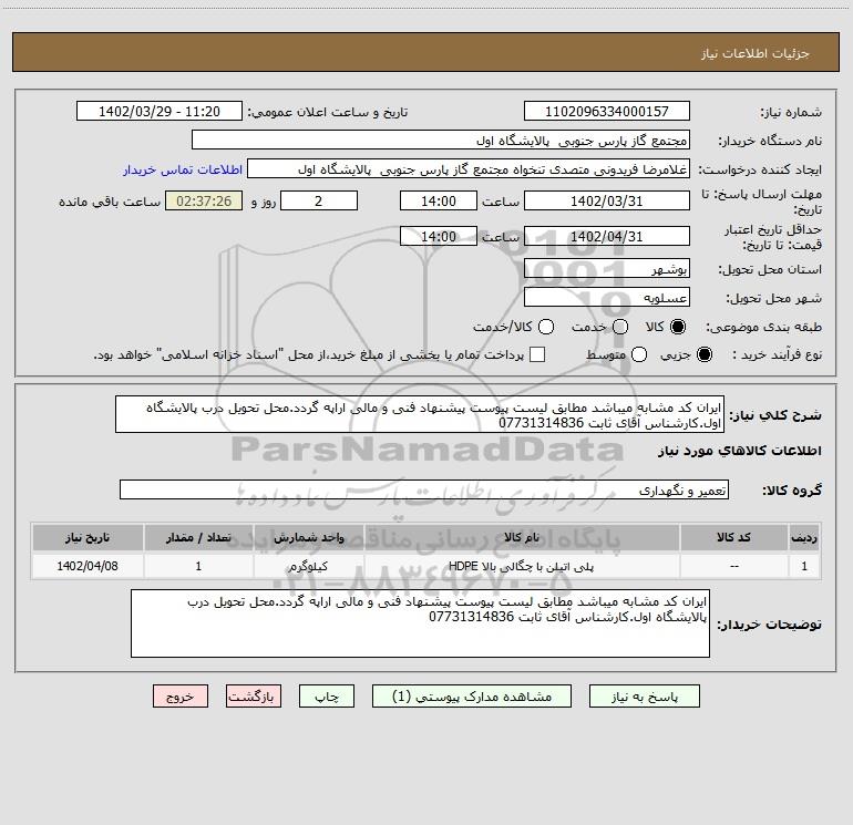 استعلام بها و موضوع استعلام استعلام ایران کد مشابه میباشد مطابق لیست پیوست پیشنهاد فنی و مالی اراپه گردد.محل تحویل درب پالایشگاه اول.کارشناس آقای ثابت 07731314836 به اطلاع کلیه شرکتها و افراد متخصص واجد شرایط میرساند، آگهی گذار در نظر دارد از طریق استعلام بها، نسبت به انتخاب و دریافت پیشنهادات اقدام نماید. این استعلام با کد آگهی ثبت شده در سامانه خبرگزاری پارس نماد : 5974666 منتشر شده است. مشخصات استعلام : تاریخ شروع استعلام: 1402/03/29 آخرین مهلت ارسال پیشنهاد قیمت : 1402/03/31 و محل اجرای پروژه : استان بوشهر میباشد. استعلام قیمت مورد درخواست : استعلام ایران کد مشابه میباشد مطابق لیست پیوست پیشنهاد فنی و مالی اراپه گردد.محل تحویل درب پالایشگاه اول.کارشناس آقای ثابت 07731314836 با دستهبندیهای تخصصی و گروه های مرتبط : قطعات پلاستیکی, مواد شیمیایی, مواد اولیه کارخانجات, استعلام اطلاع رسانی میگردد.