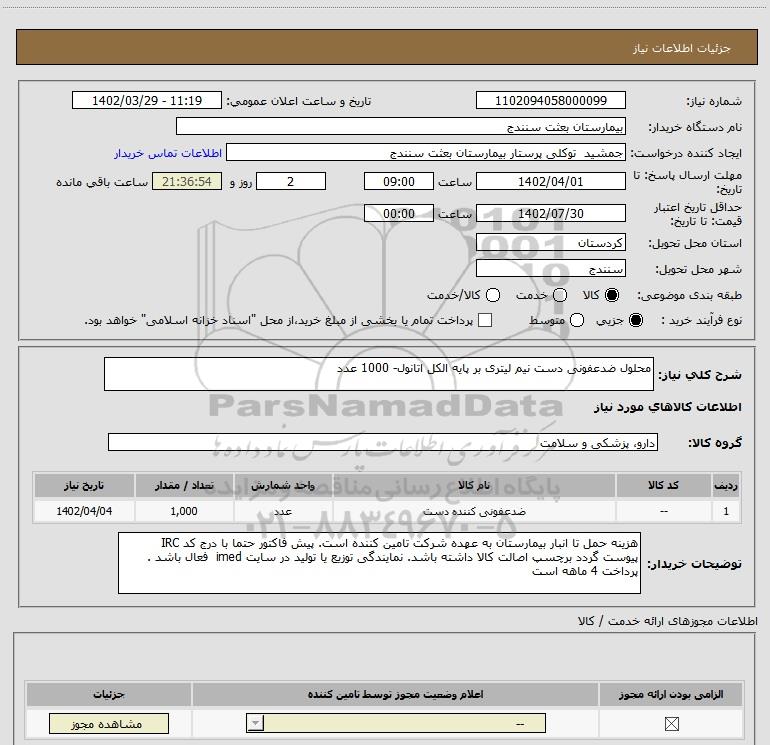 | 1 | -- | ضدعفونی کننده دست | عدد | 1,000 | 1402/04/04 |