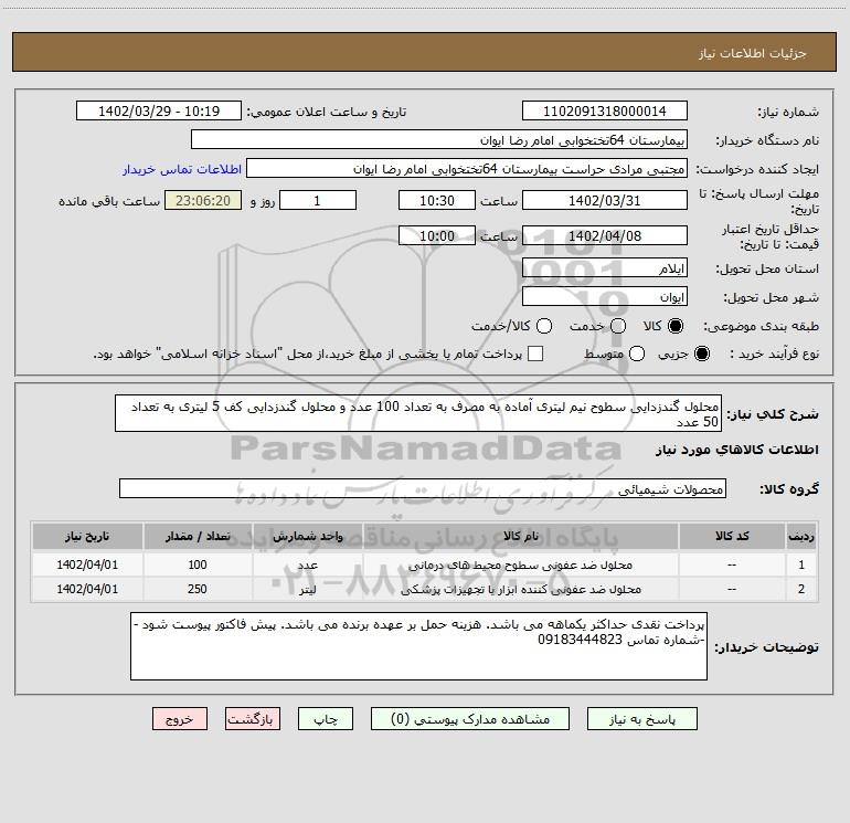 شرح کلی نیاز: محلول گندزدایی سطوح نیم لیتری آماده به مصرف به تعداد 100 عدد و محلول گندزدایی کف 5 لیتری به تعداد 50 عدد