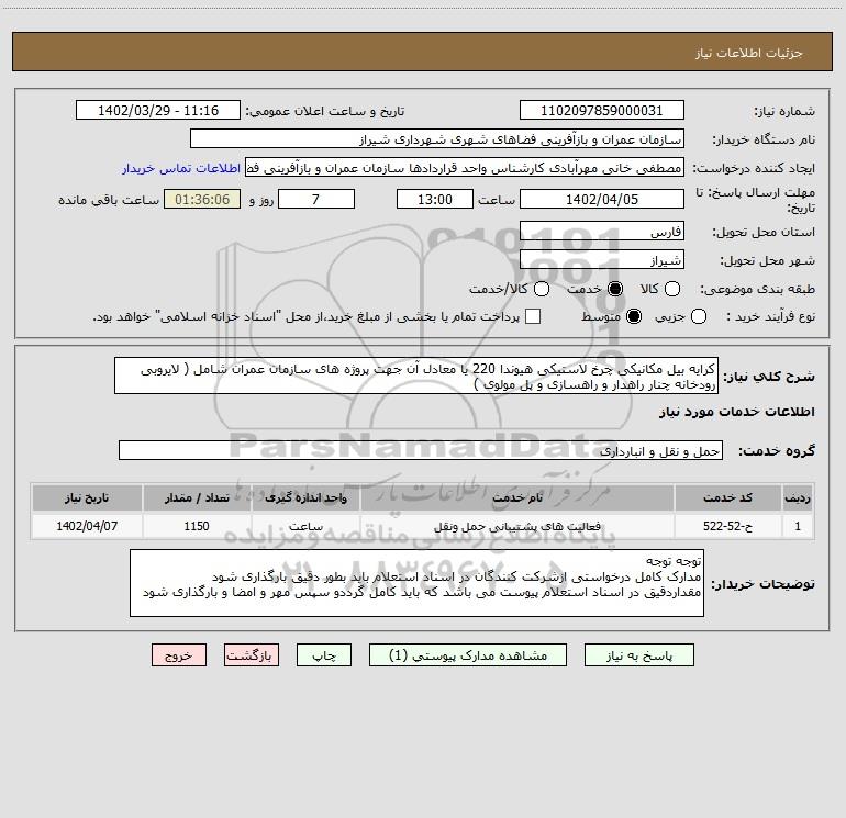 شرح کلی نیاز: کرایه بیل مکانیکی چرخ لاستیکی هیوندا 220 یا معادل آن جهت پروژه های سازمان عمران شامل ( لایروبی رودخانه چنار راهدار و راهسازی و پل مولوی )