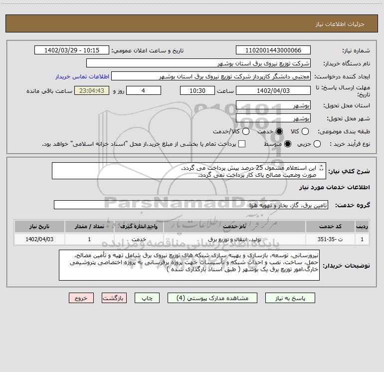 شرح کلی نیاز: این استعلام مشمول 25 درصد پیش پرداخت می گردد.