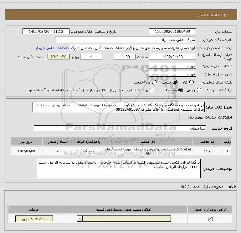 شرح کلی نیاز: تهیه و نصب دو دستگاه برج خنک کننده و اصلاح فونداسیون مربوطه بهمراه متعلقات سیستم برودتی ساختمان مرکزی ششم- هماهنگی با آقای علیاری 09122495697