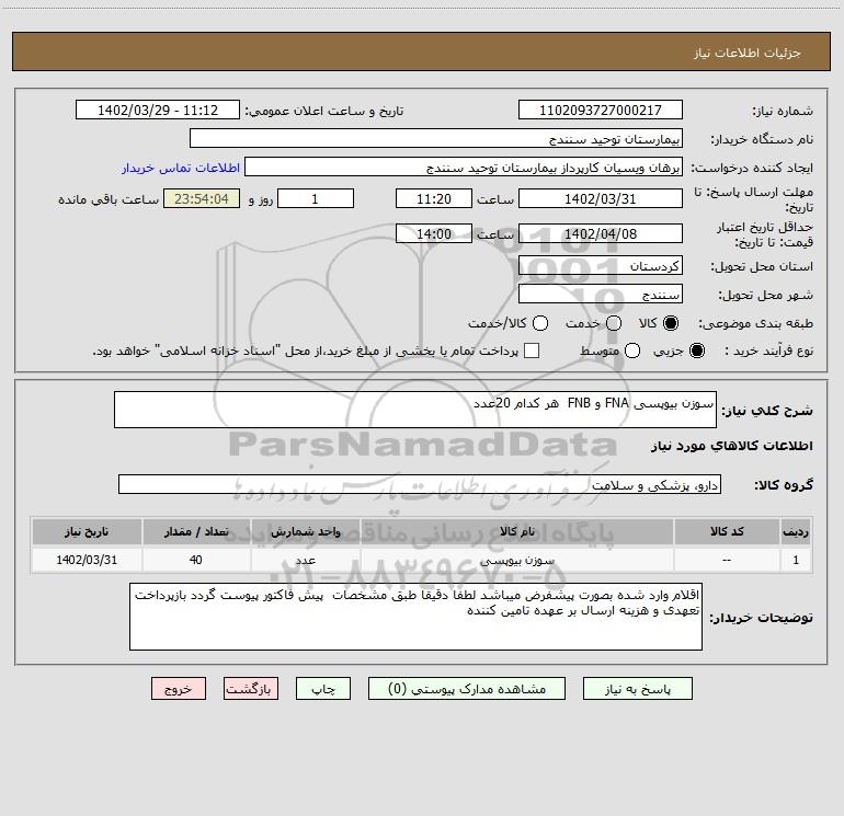 شرح کلی نیاز: سوزن بیوپسی FNA و FNB هر کدام 20عدد