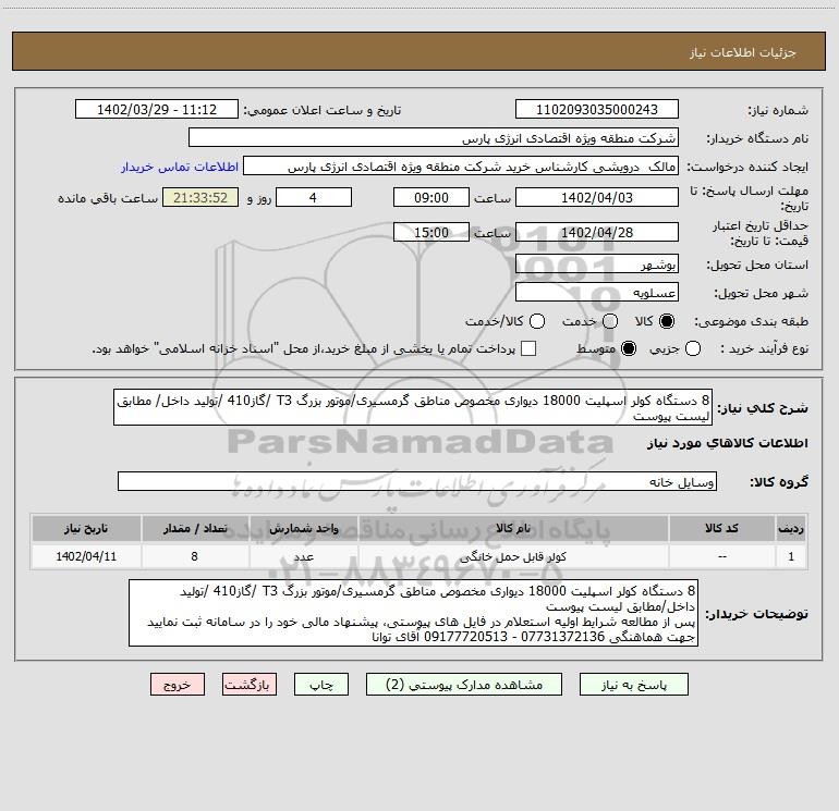نام دستگاه خریدار:شرکت منطقه ویژه اقتصادی انرژی پارس