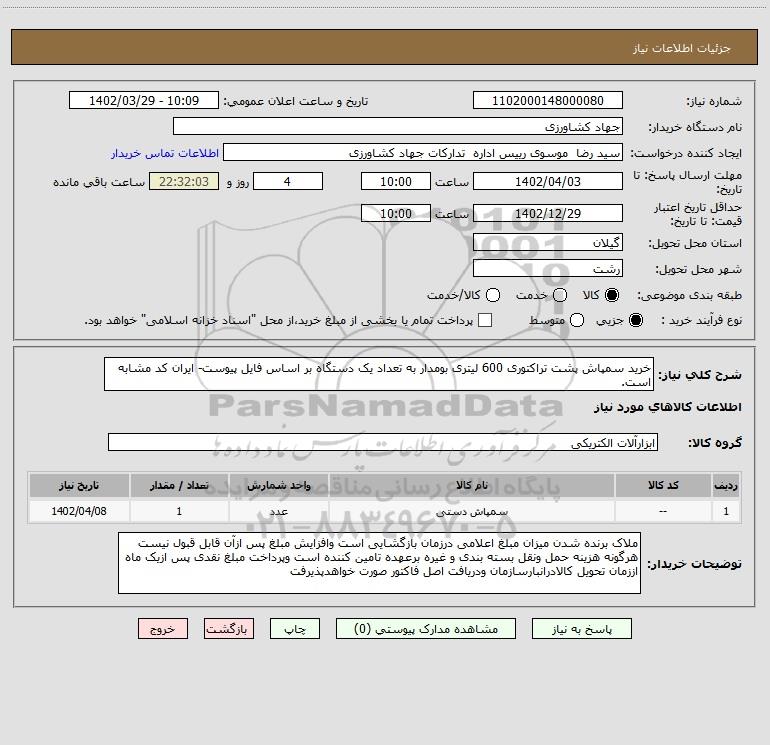استعلام بها و موضوع استعلام استعلام خرید سمپاش پشت تراکتوری 600 لیتری بومدار به تعداد یک دستگاه بر اساس فایل پیوست- ایران کد مشابه است. به اطلاع کلیه شرکتها و افراد متخصص واجد شرایط میرساند، آگهی گذار در نظر دارد از طریق استعلام بها، نسبت به انتخاب و دریافت پیشنهادات اقدام نماید. این استعلام با کد آگهی ثبت شده در سامانه خبرگزاری پارس نماد : 5974757 منتشر شده است. مشخصات استعلام : تاریخ شروع استعلام: 1402/03/29 آخرین مهلت ارسال پیشنهاد قیمت : 1402/04/03 و محل اجرای پروژه : استان گیلان میباشد. استعلام قیمت مورد درخواست : استعلام خرید سمپاش پشت تراکتوری 600 لیتری بومدار به تعداد یک دستگاه بر اساس فایل پیوست- ایران کد مشابه است. با دستهبندیهای تخصصی و گروه های مرتبط : تجهیزات و خدمات کشاورزی و دامپروری, استعلام اطلاع رسانی میگردد.