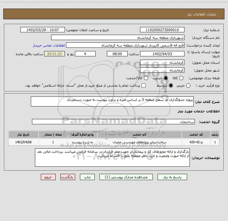 شرح کلی نیاز: پروژه جدولگذاری در سطح منطقه 3 بر اساس متره و برآورد پیوست به صورت دستمزدی