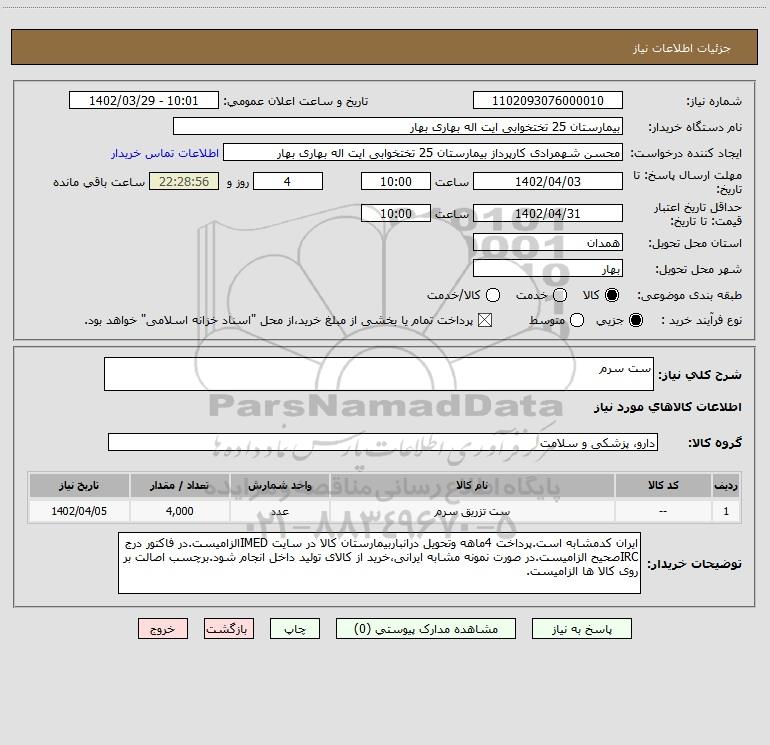 | 1 | -- | ست تزریق سرم | عدد | 4,000 | 1402/04/05 |