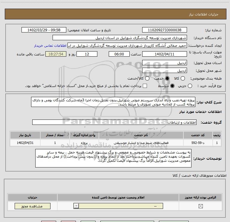 شرح کلی نیاز: پروژه تهیه،نصب و راه اندازی سیستم صوتی شورابیل.بدون تعدیل.زمان اجرا 3ماه،شرکت کنندگان بومی و دارای پروانه کسب از اتحادیه صوتی تصویری یا مرتبط باشد.