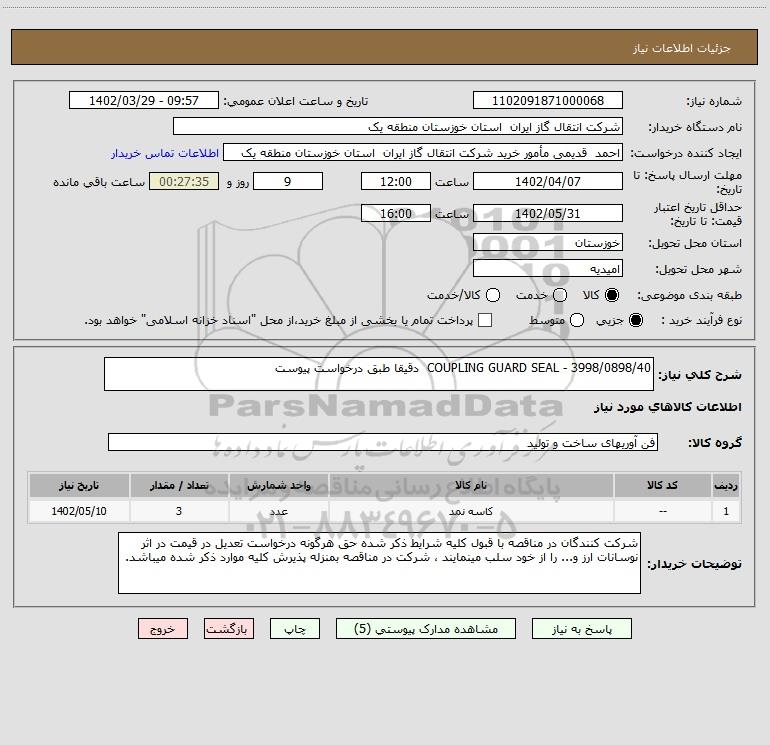 شرح کلی نیاز: COUPLING GUARD SEAL - 3998/0898/40 دقیقا طبق درخواست پیوست