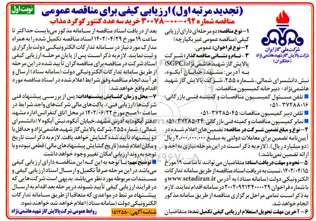 علاقهمندان میتوانند جهت دریافت اسناد و اطلاعات تکمیلی، تجدید ارزیابی کیفی مناقصه خرید سه عدد کنتور گوگرد مذاب با سامانه مناقصات و مزایدات ایران پارسنماد داده ها 88349670 تماس حاصل نمایند.