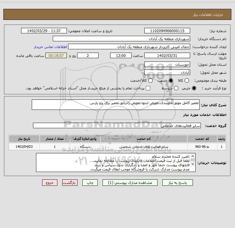 شرح کلی نیاز: تعمیر کامل موتور،جلوبندی،تعویض لنتها،تعویض رادیاتور،تعمیر برق پژو پارس