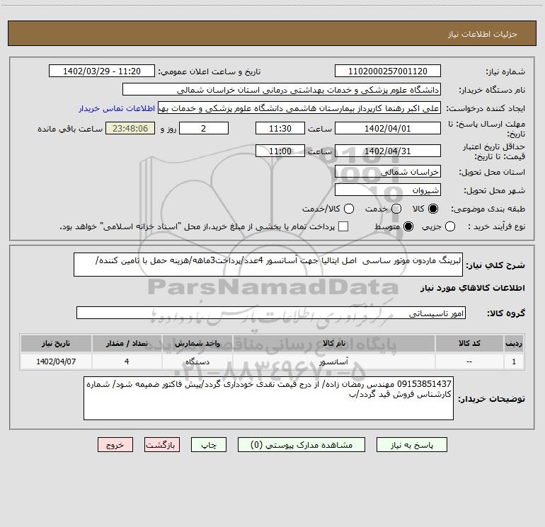 شرح کلی نیاز: لبرینگ ماردون موتور ساسی اصل ایتالیا جهت آسانسور 4عدد/پرداخت3ماهه/هزینه حمل با تامین کننده/