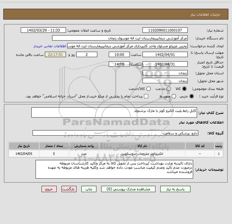 شرح کلی نیاز: کابل رابط پلیت الکترو کوتر با مارک برشتولد